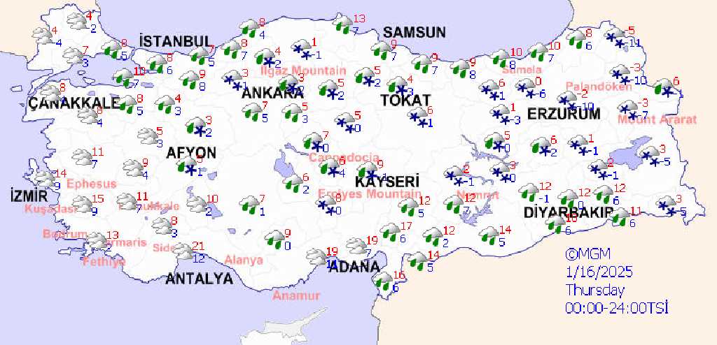 Tahminlere göre yurt genelinin çok bulutlu ve yağışlı geçmesi bekleniyor. Kıyı Ege ile Akdeniz kıyılarında yer yer gök gürültülü sağanak görülecek. İç Ege’nin yüksekleri, İç Anadolu’nun kuzeydoğusu, Karadeniz’in iç kesimleri ve Doğu Anadolu’da yağışların karla karışık yağmur ve kar şeklinde etkili olması öngörülüyor. Güney Ege, Batı Akdeniz, İç Anadolu’nun güneyi ve Doğu Karadeniz’in iç kesimlerinde rüzgarın yer yer kuvvetli esmesi bekleniyor.