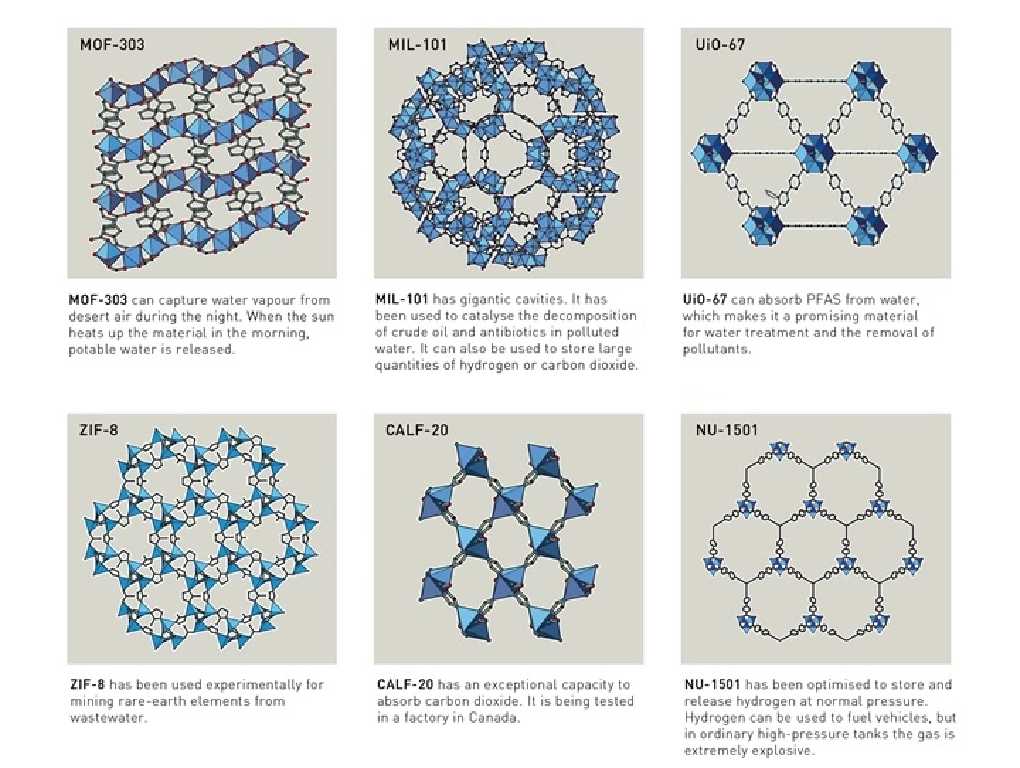 Bugün on binlerce farklı MOF yapısı tanımlanmış durumda. Bu yapılar;