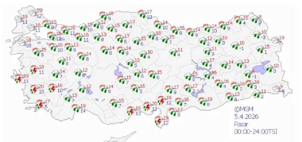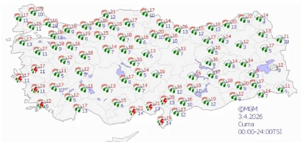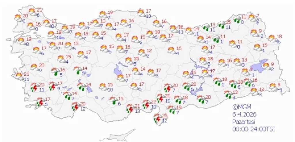 Antalya’nın merkez ve doğu ilçelerinde yerel olarak çok kuvvetli sağanak öngörülürken, Mersin, Adana, Hatay, Osmaniye ve Kahramanmaraş çevrelerinde aralıklı ve yerel kuvvetli yağışlar görülecek.