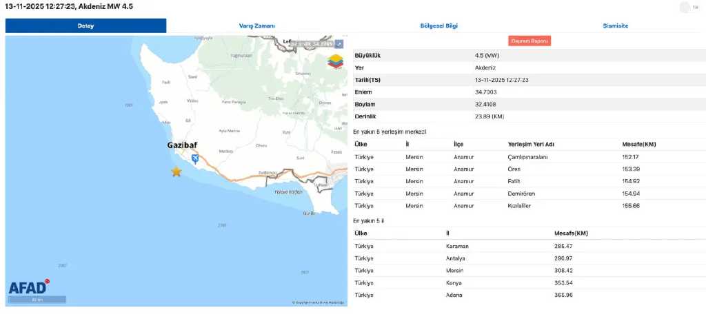 Akdeniz’de saat 12.27’de meydana gelen deprem, bölgede kısa süreli paniğe neden oldu. AFAD’ın paylaştığı bilgilere göre sarsıntının büyüklüğü 4.5 olarak kaydedildi. Depremin 23.89 kilometre derinlikte gerçekleştiği belirtildi.