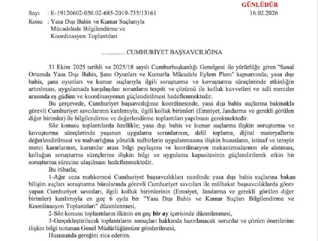Yasa dışı bahis ve sanal kumarla mücadele kapsamında Türkiye genelinde yeni bir adım atıldı. Adalet Bakanı Akın Gürlek’in talimatıyla 81 ilde bilişim suçları savcılarının katılımıyla Emniyet ve Jandarma birimleri arasında düzenli koordinasyon toplantıları yapılacak.