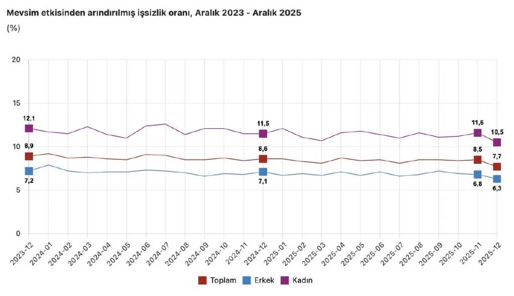 Türkiye İstatistik Kurumu, 2025 yılı Aralık ayına ilişkin iş gücü istatistiklerini açıkladı. Buna göre işsizlik oranı, bir önceki aya göre 0,8 puan düşerek yüzde 7,7 seviyesine indi. Kasım ayında işsizlik oranı yüzde 8,6 olarak kaydedilmişti. Mevsim etkisinden arındırılmış verilere göre işsiz sayısı ise 286 bin kişi azalarak 2 milyon 736 bine geriledi.