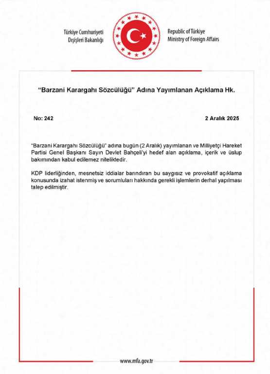 Dışişleri Bakanlığı, Kürdistan Demokrat Partisi’ne (KDP) bağlı “Barzani Karargahı Sözcülüğü” tarafından MHP Genel Başkanı Devlet Bahçeli’yi hedef alan açıklamaya sert bir yanıt verdi.