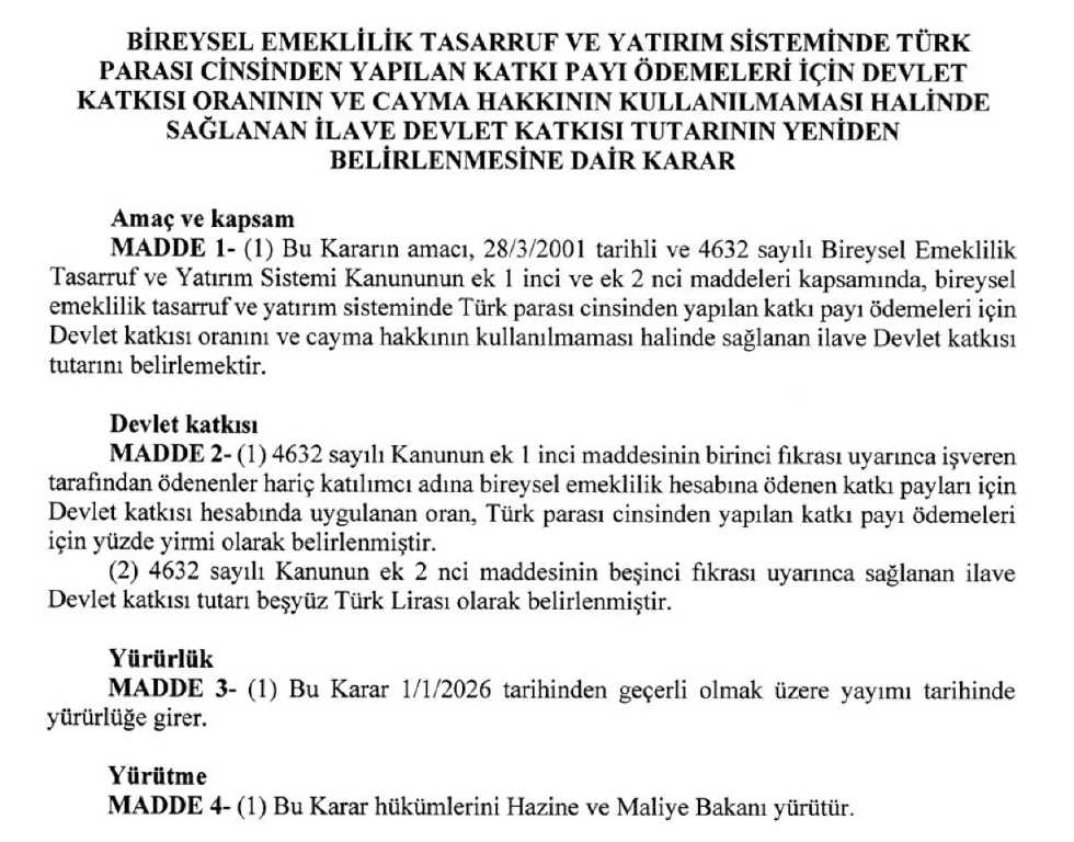 Yayımlanan karara göre, 4632 sayılı Bireysel Emeklilik Tasarruf ve Yatırım Sistemi Kanunu kapsamında katılımcıların bireysel emeklilik hesaplarına yatırdıkları katkı payları için devlet katkısı artık yüzde 20 oranında uygulanacak. İşveren tarafından ödenen katkı payları ise bu kapsamın dışında tutuldu.