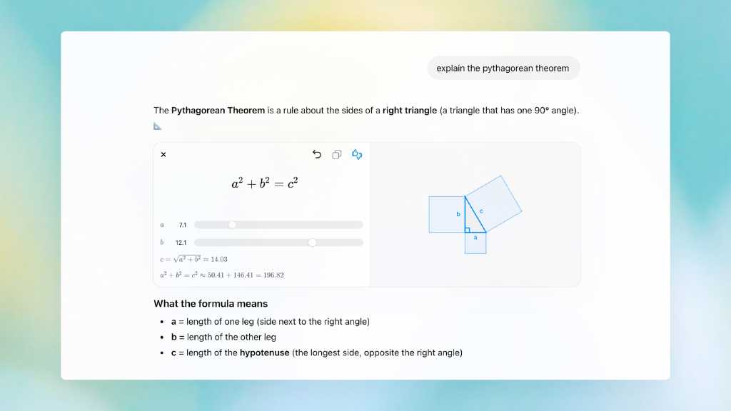 Yeni özellikle birlikte ChatGPT, Pisagor teoremi, Coulomb yasası ve mercek denklemleri gibi bilimsel konuları anlatırken kullanıcıya etkileşimli grafikler sunabilecek. Bu görsellerde kullanıcılar formüllerdeki değişkenleri değiştirebilecek ve parametrelerle oynayarak sonuçların nasıl değiştiğini gözlemleyebilecek.