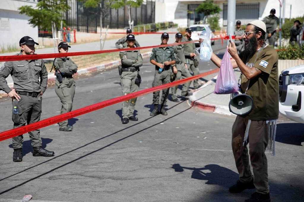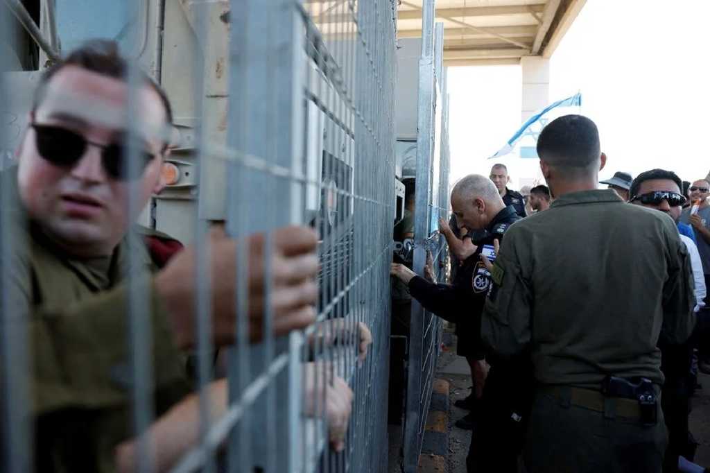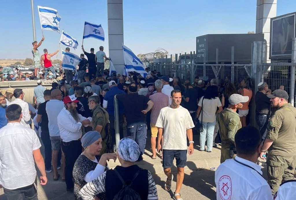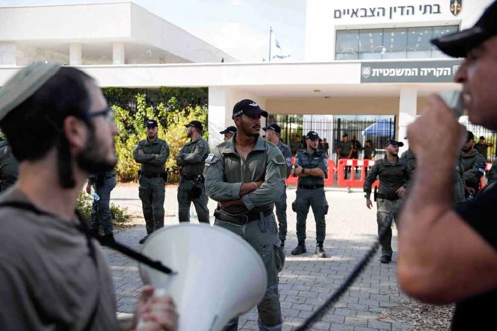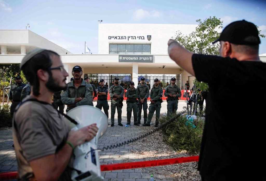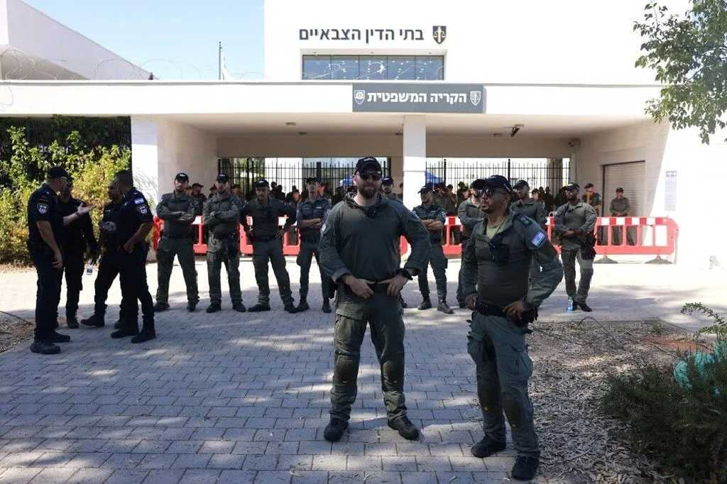 Aralarında Aşırı Sağcı Miras Bakanı Amihay Eliyahu'nun da bulunduğu kalabalık grup, askerlerin çıkarıldığı askeri mahkemenin de içinde bulunduğu üsse girmeye çalıştı.