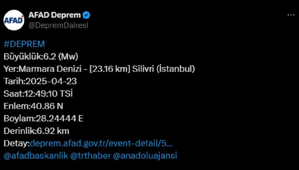 AFAD'dan yapılan açıklamaya göre deprem 6,2 büyüklüğünde.