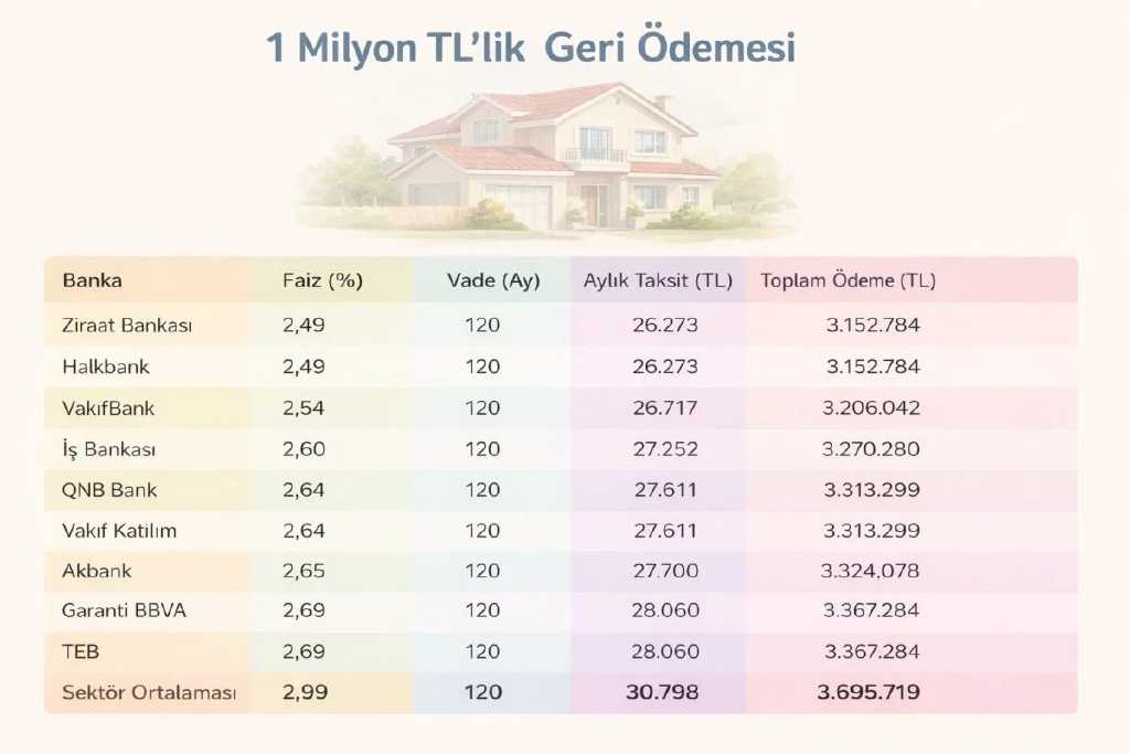 Aylık yüzde 2,99 faiz oranıyla 120 ay vadeli 1 milyon TL kredi kullanıldığında aylık taksit 30 bin 798 TL, toplam geri ödeme ise 3 milyon 695 bin TL seviyesinde oluyor.