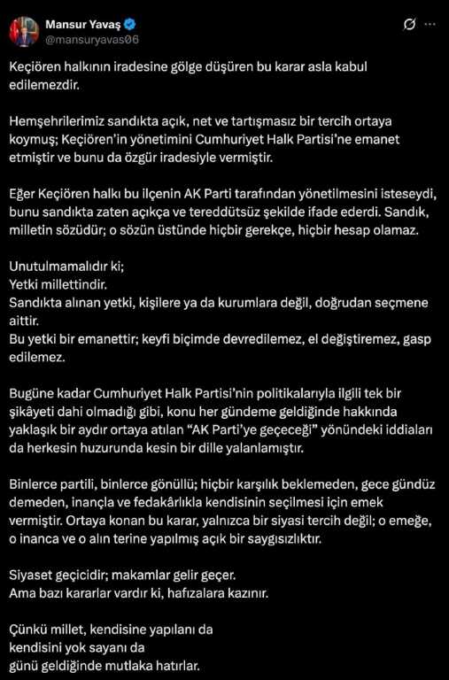 MANSUR YAVAŞ’TAN MESUT ÖZARSLAN’A SERT TEPKİ: BU KARAR ASLA KABUL EDİLEMEZDİR
