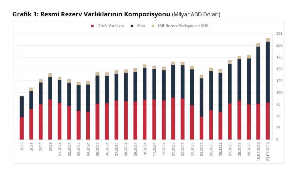 Altın rezervlerindeki artış ise dikkat çekti. 23 Ocak haftasında altın rezervleri 8 milyar 390 milyon dolar yükselerek 121 milyar 22 milyon dolardan 129 milyar 412 milyon dolara ulaştı. Bu artış, toplam rezervlerdeki güçlü yükselişin ana unsurlarından biri oldu.