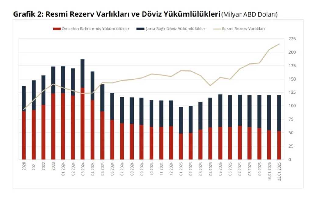 Türkiye Cumhuriyet Merkez Bankası toplam rezervleri, 23 Ocak haftasında bir önceki haftaya göre 10 milyar 437 milyon dolar artış gösterdi. Bir önceki hafta 200 milyar dolar eşiğinin aşılmasının ardından, rezerv büyüklüğü kısa sürede 215,6 milyar dolara yükseldi.