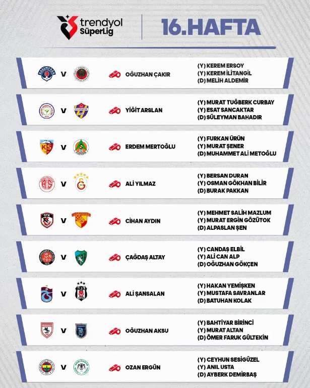 Türkiye Futbol Federasyonu Merkez Hakem Kurulu (MHK), Trendyol Süper Lig’in 15. haftasında oynanan Galatasaray–Samsunspor maçındaki yönetimi tepki çeken Mehmet Türkmen’le ilgili kararını açıkladı. Kritik karşılaşmada verdiği kararlar hem Galatasaray hem de Samsunspor tarafından yoğun şekilde eleştirilen hakemin durumu netleşti.
