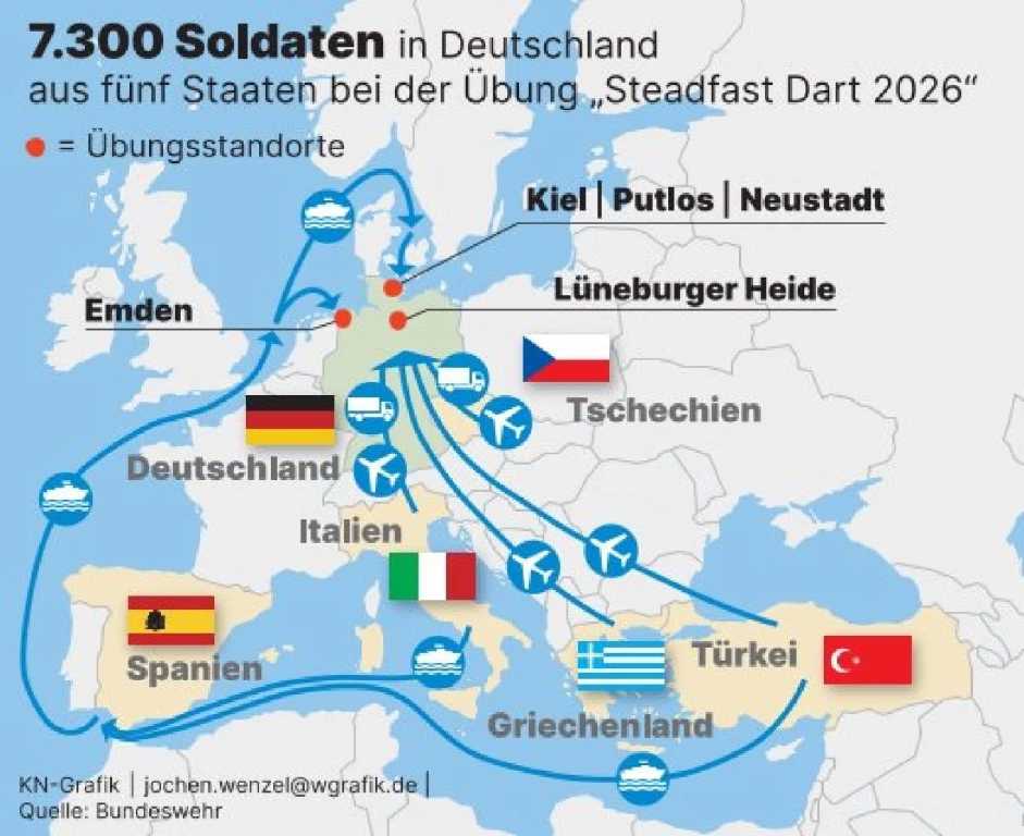 Alman gazetesi Kieler Nachrichten, tatbikata ilişkin analizinde “Türkiye’den bin 500 asker yola çıktı” başlığını kullandı. Gazete, Steadfast Dart 2026 kapsamındaki en güçlü askeri katılımın Türkiye tarafından sağlandığını vurguladı.