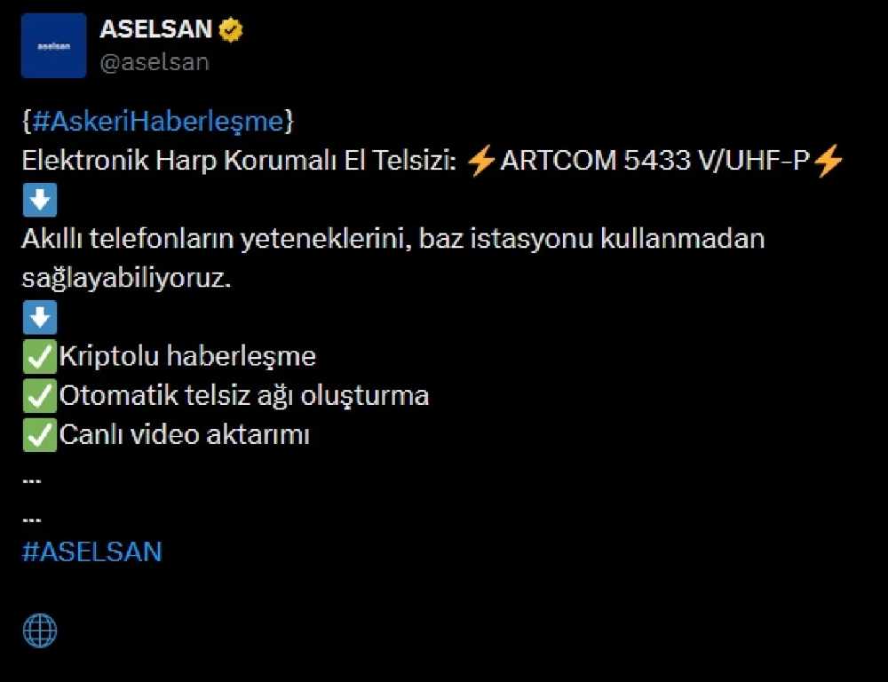 Lübnan'daki patlamaların ardından ASELSAN, geliştirdiği yerli ve milli el telsizi "ARTCOM 5433 V/UHF-P"nin görsellerini paylaşarak, güvenli haberleşme için yenilikçi çözümler sunduğunu duyurdu.