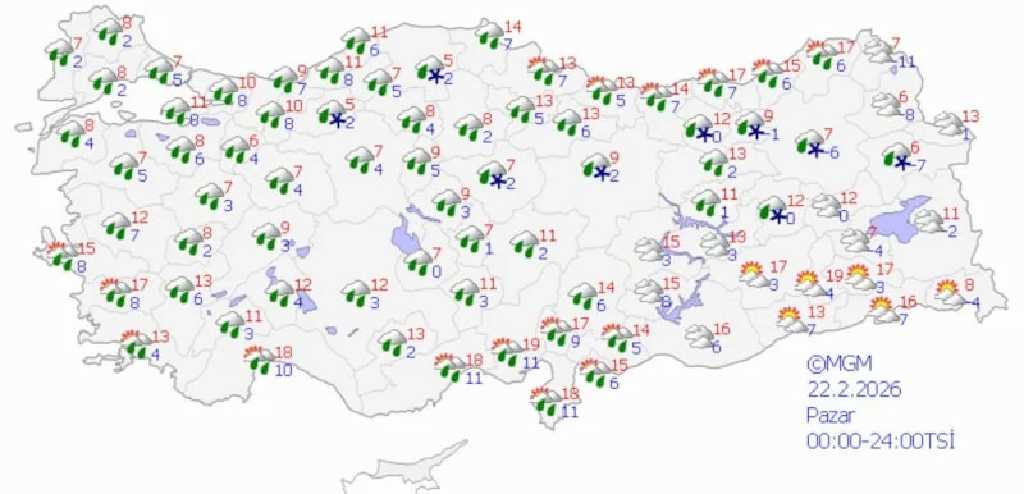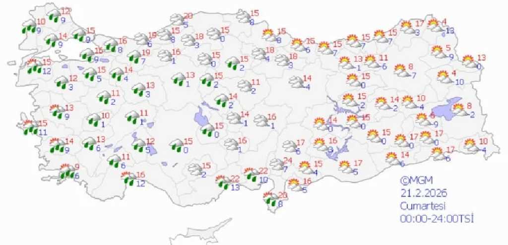 Bugün yurt genelinde ılıman hava etkili olurken güney kıyılarda sıcaklıklar 15-20 derece, iç kesimlerde 8-14 derece bandında seyrediyor. Günün ilerleyen saatlerinde Marmara, Ege ve Batı Akdeniz’de sağanak yağışların başlaması öngörülüyor. Doğu Karadeniz ile Doğu Anadolu’nun kuzeyinde ise yer yer karla karışık yağmur ve kar görülüyor.
