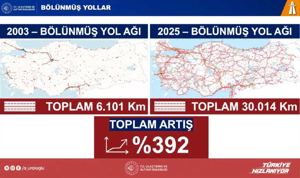 • Bölünmüş yol ağı 2002’de 6 bin 101 kilometreyken bugün 30 bin 14 kilometreye çıktı.