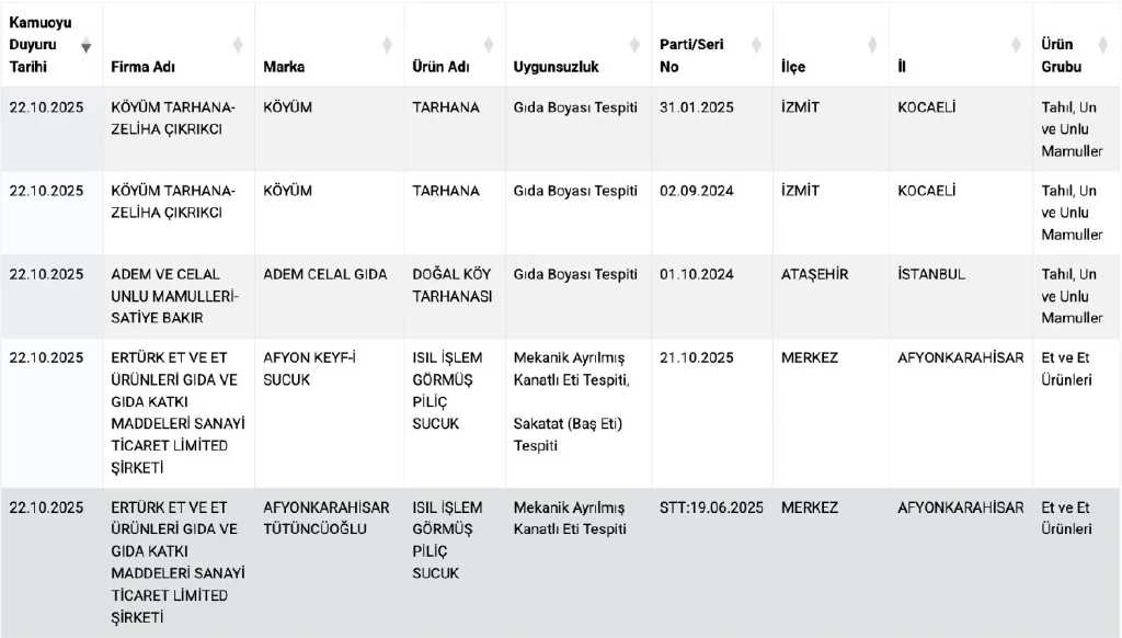 Denetimlerde bazı markaların “tarhana” adıyla satışa sunduğu ürünlerde gıda boyası kullanıldığı tespit edildi. Et ve et ürünleri kategorisinde ise ciddi ihlaller ortaya çıktı. Bakanlık verilerine göre, bazı işletmelerin lahmacun harcında kanatlı et kullandığı, kıymalı kol böreği olarak satılan ürünlerde ise sakatat ve kanatlı et karışımı bulundu.