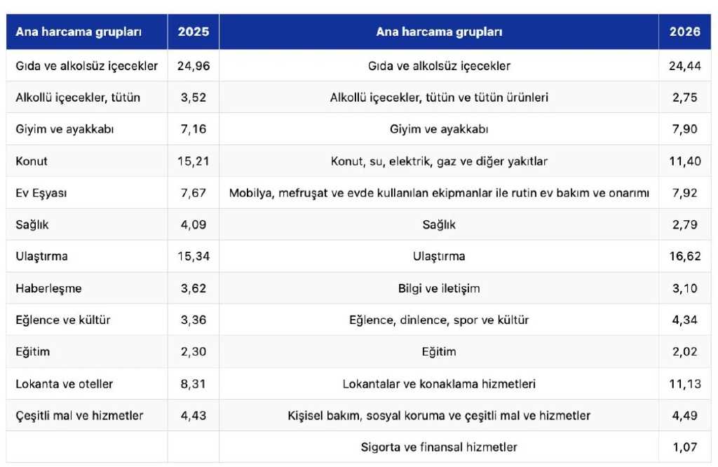 Yeni dönemde gıda ve alkolsüz içeceklerin TÜFE içindeki ağırlığı yüzde 24,44’e geriledi. Ulaştırmanın ağırlığı yüzde 16,62’ye yükselirken, konut, su, elektrik, gaz ve diğer yakıtların payı yüzde 11,40 olarak belirlendi. Sigorta ve finansal hizmetler ise yüzde 1,07 ağırlıkla yeni bir ana harcama grubu olarak endekse dahil edildi.