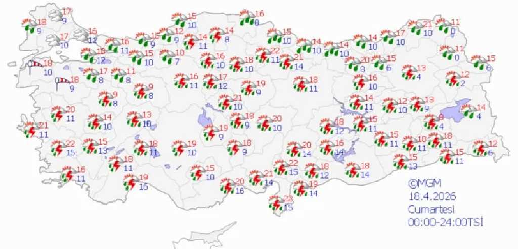 18-21 Nisan tarihleri arasında özellikle iç ve doğu kesimlerde yerel olarak kuvvetli yağış bekleniyor. Yetkililer, yıldırım, kısa süreli dolu ve ani sel riskine karşı dikkatli olunması gerektiğini bildirdi.