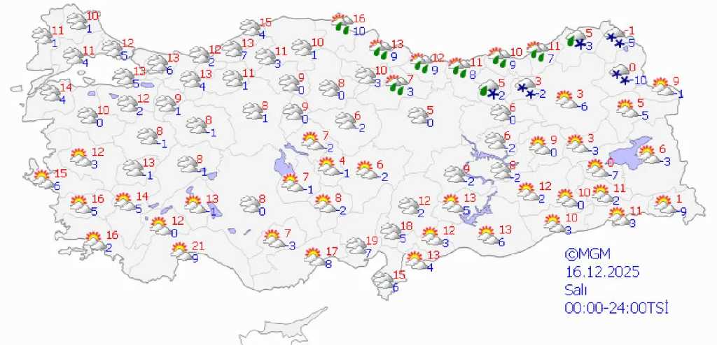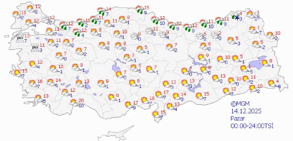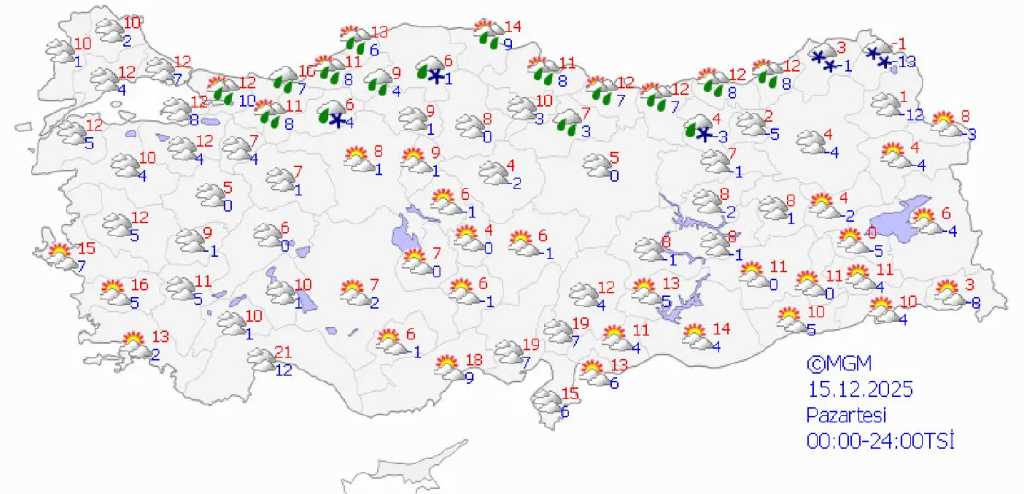 Pazar günü parçalı ve çok bulutlu hava etkisini sürdürecek. Güney ve doğu kesimlerde yağmur ve sağanak görülürken, doğu bölgelerin yükseklerinde karla karışık yağmur bekleniyor. Ankara’da sıcaklık 2-8 derece, Antalya’da 12-18 derece, Van’da ise -2 ile 4 derece civarında olacak.