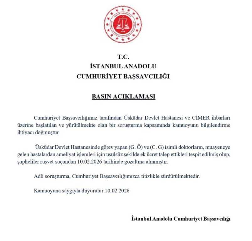 Başsavcılık tarafından yapılan açıklamada, CİMER’e yapılan ihbarlar üzerine Üsküdar Devlet Hastanesi’nde inceleme başlatıldığı belirtildi. Soruşturma kapsamında hastanede görev yapan G.Ö. ve C.G. isimli doktorların, muayeneye gelen hastalardan ameliyat işlemleri için usulsüz şekilde ek ücret talep ettiklerinin tespit edildiği bildirildi.