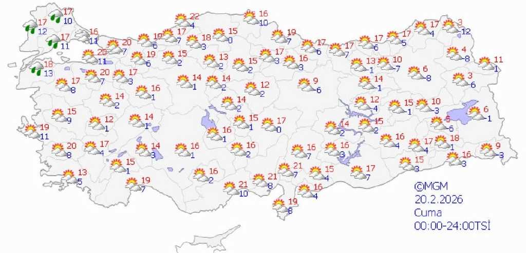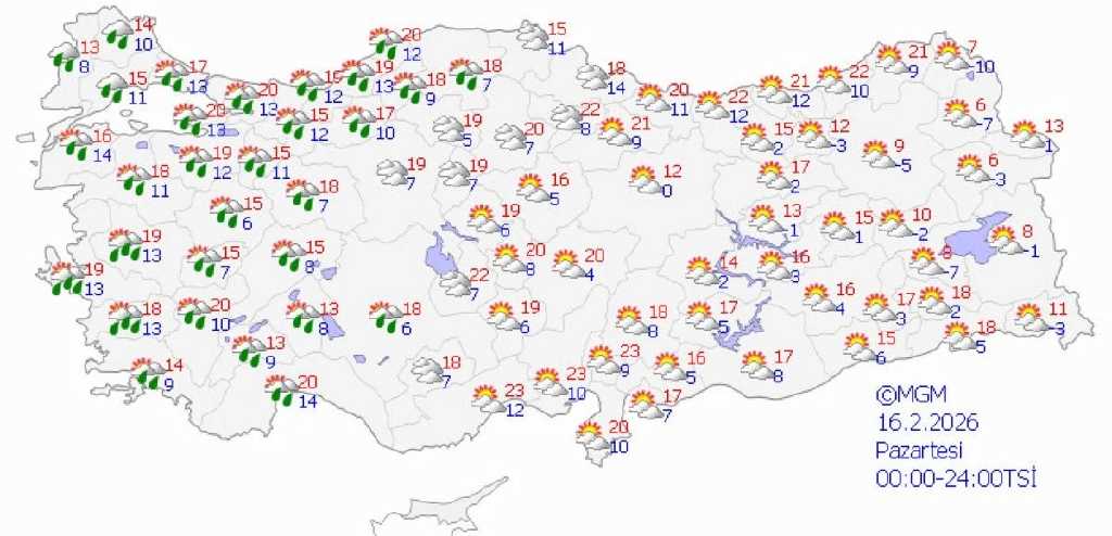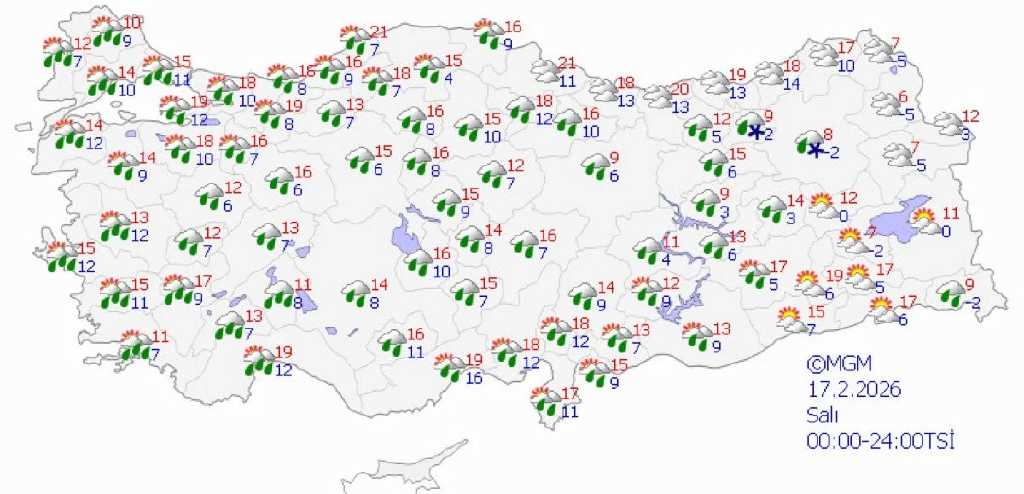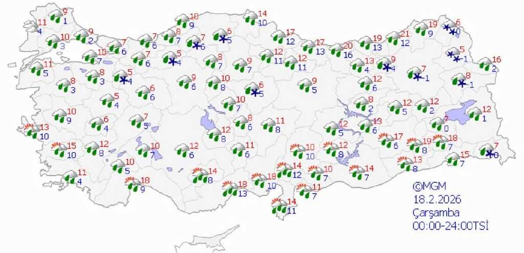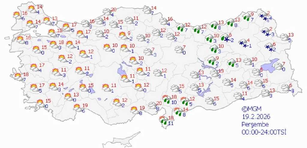 Meteoroloji Genel Müdürlüğü verilerine göre Türkiye genelinde parçalı ve çok bulutlu hava etkili olurken birçok bölgede yağış bekleniyor. Özellikle batı ve iç kesimlerde sağanak yağmur görülmesi öngörülürken doğu ve yüksek rakımlı bölgelerde karla karışık yağmur ve kar yağışı etkisini gösterecek.