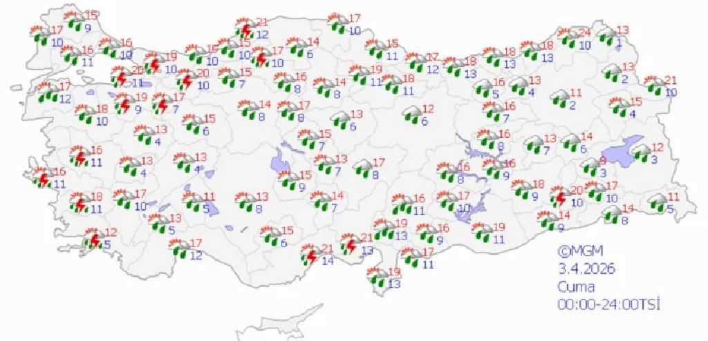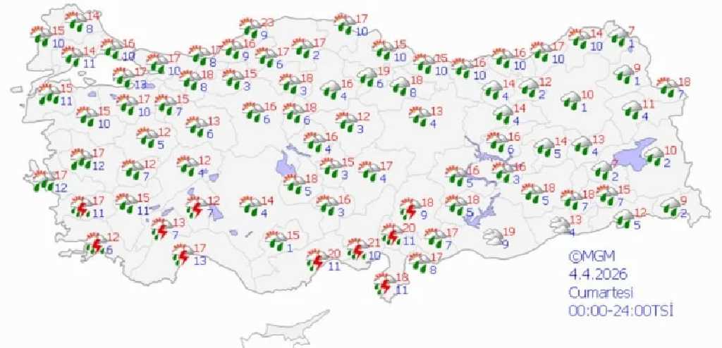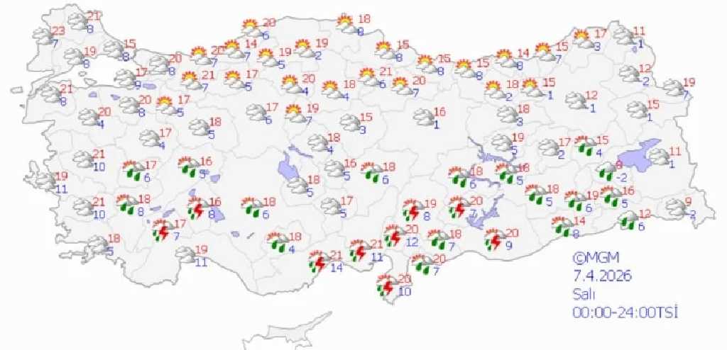 Yapılan tahminlere göre bugün özellikle Marmara’nın güneyi, Ege, Akdeniz’in iç kesimleri ve İç Anadolu’nun batısında sağanak ve gök gürültülü sağanak yağış görülecek. Doğu Anadolu’nun bazı bölgelerinde de yerel yağışlar etkili olacak.