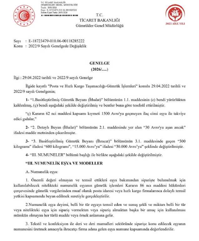 Genelgeye göre kıymeti 30 euroyu aşmayan ve “MODEL” muafiyet kodu ile beyan edilen ürünler, basitleştirilmiş gümrük beyannamesiyle ithal edilebilecek. Bu uygulama yalnızca posta ve hızlı kargo taşımacılığı yoluyla gelen, ticari nitelik taşımayan ürünler için geçerli olacak.