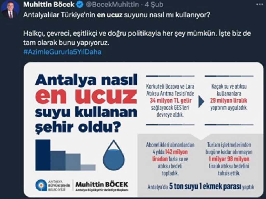 Öte yandan CHP'li Antalya Büyükşehir Belediye Başkanı Muhittin Böcek'in seçim döneminde 'en ucuz suyu biz kullanıyoruz' ifadeleriyle yaptığı propaganda akıllara geldi.