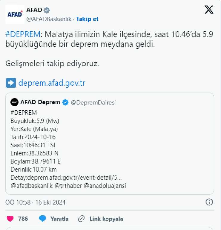 İçişleri Bakanı Ali Yerlikaya, X hesabından "Malatya’nın Kale ilçesinde 5.9 büyüklüğünde meydana gelen depremde AFAD ve ilgili kurumlarımızın tüm ekipleri saha taramalarına başladı.