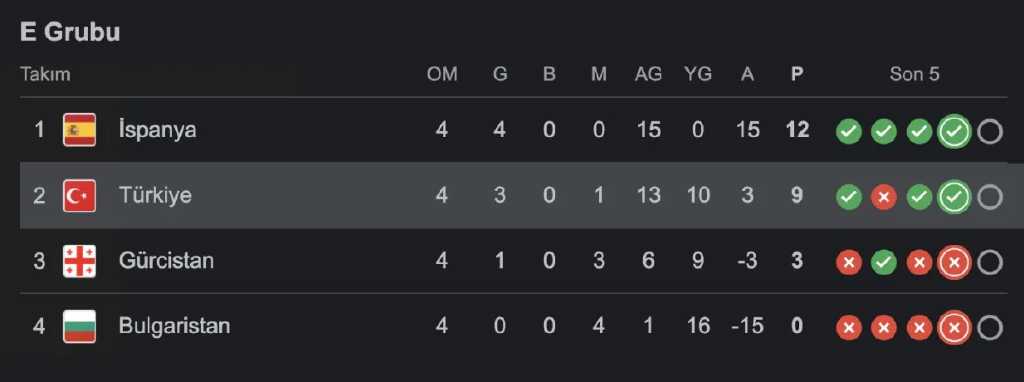 E Grubu’nda 12 puanla İspanya liderliğini sürdürürken, Türkiye 9 puanla ikinci sırada yer aldı. Gürcistan 3 puanla üçüncü, Bulgaristan ise henüz puanla tanışamadı. Ay-yıldızlılar, kalan iki maçta alacakları 1 puanla ikinciliği ve play-off biletini garantileyecek.