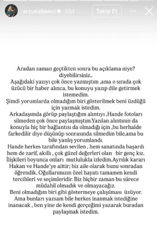 Bugün sosyal medya hesabından uzun bir açıklama yapan Arzu Sabancı, hakkındaki iddiaları reddetti. “Arkadaşımda görüp paylaştığım alıntıyı, Hande fotoları silmeden çok önce paylaşmıştım. Yazılan alıntının da konuyla hiçbir bağlantısı olmadığı için silme gereği bile duymadım. Ancak bu bile yanlış yorumlandı.” ifadelerini kullandı.