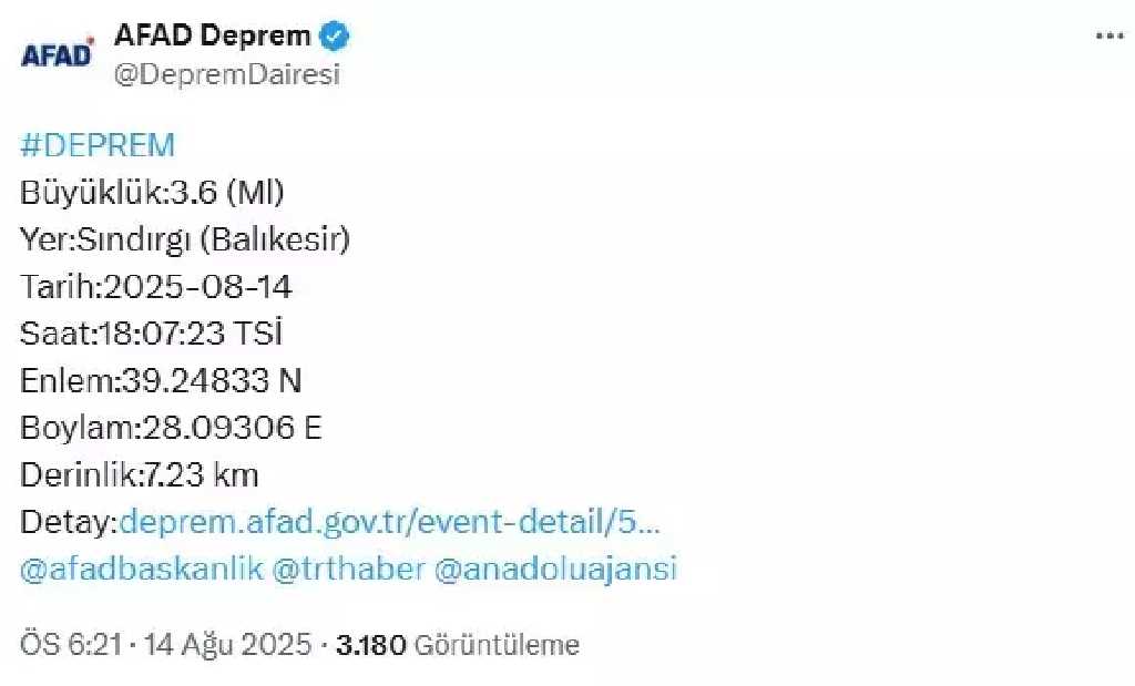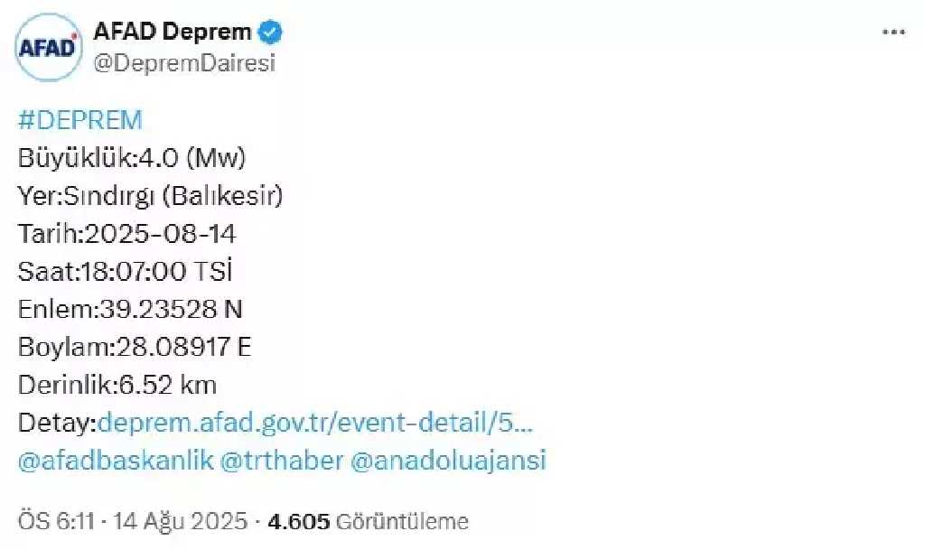 Balıkesir’in Sındırgı ilçesinde 10 Ağustos’ta meydana gelen 6,1 büyüklüğündeki depremin ardından artçı sarsıntılar sürüyor. İlçede bugün saniyeler içinde peş peşe 4,0 ve 3,6 büyüklüğünde iki deprem yaşandı.