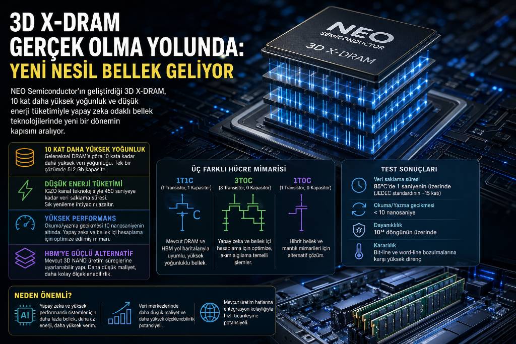 ABD merkezli NEO Semiconductor tarafından geliştirilen 3D X-DRAM teknolojisi, bellek dünyasında önemli bir değişimin habercisi oldu. Şirket, yeni nesil bellek mimarisinin kavramsal doğrulamasını tamamladığını duyurarak, klasik DRAM sınırlarının aşılabileceğini ortaya koydu.