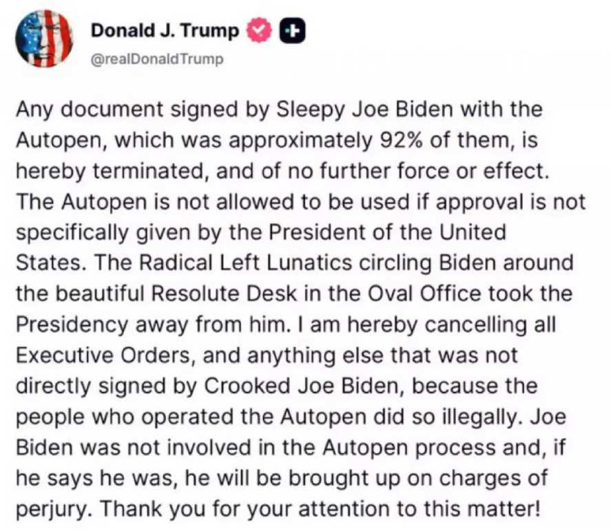 Trump açıklamasında, Biden döneminde Autopen ile imzalanmış tüm başkanlık kararnamelerini iptal ettiğini duyurdu.