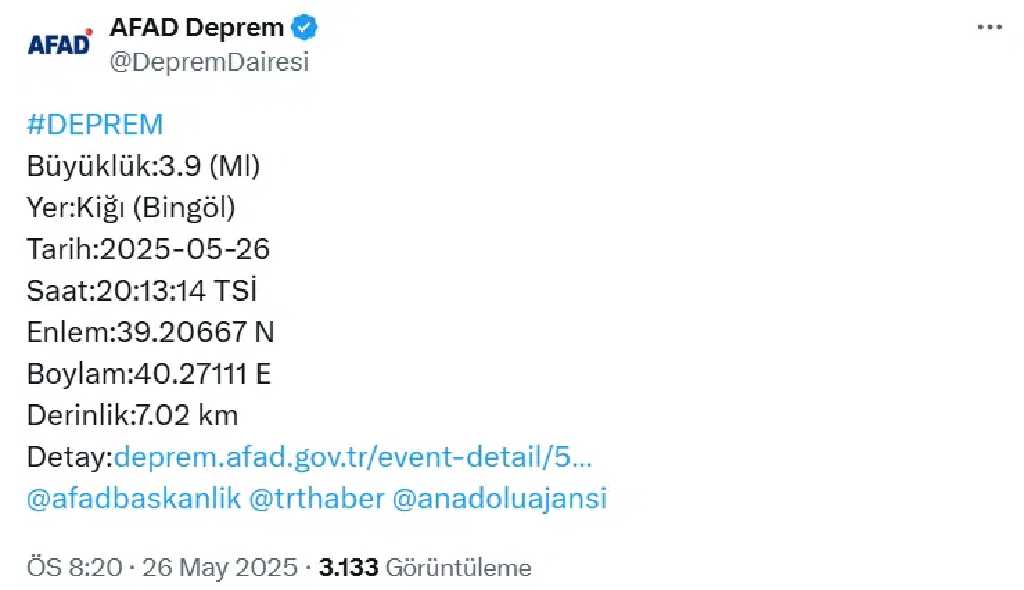 AFAD, Bingöl'ün Kiğı ilçesinde 3.9 büyüklüğünde deprem meydana geldiğini duyurdu.
