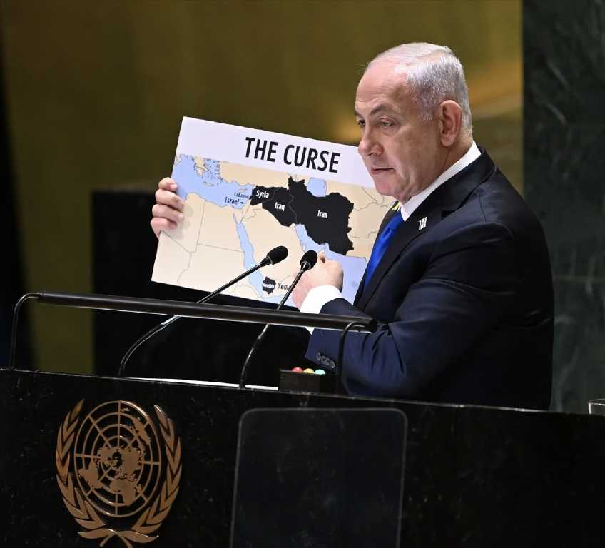 Binyamin Netanyahu, BM Genel Kurulu'nda yaptığı konuşmada Batı Şeria ve Gazze Şeridi'ni, "İsrail" olarak gösteren bir harita kullandı.