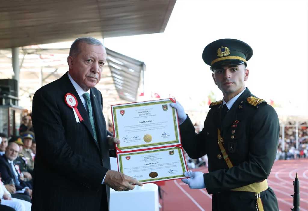Zafer Bayramı’na da vurgu yapan Erdoğan, “30 Ağustos’ta milletimiz, zillete asla rıza göstermeyeceğini, hürriyetinden ödün vermeyeceğini bir kez daha ispatlamıştır. Milletimiz esarete boyun eğmez.” dedi. Yeni mezun teğmenlere başarılar dileyen Cumhurbaşkanı, “Peygamber ocağının onurlu neferleri olarak önemli görevleri alnınızın akıyla yerine getireceksiniz.” sözleriyle genç subaylara seslendi.