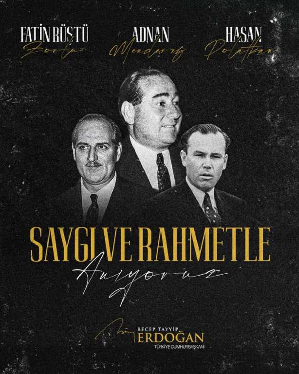 Erdoğan, 64 yıl önce idam edilen Başbakan Adnan Menderes ile bakanlar Hasan Polatkan ve Fatin Rüştü Zorlu'yu sosyal medya hesabından yaptığı paylaşımla rahmetle andı.
