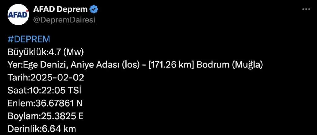 Deprem Türkiye saati ile 10.22'de Muğla'nın Bodrum ilçesinin 171 kilometre açığında Aniye Adası (İOS) çevresinde gerçekleşti.