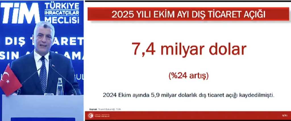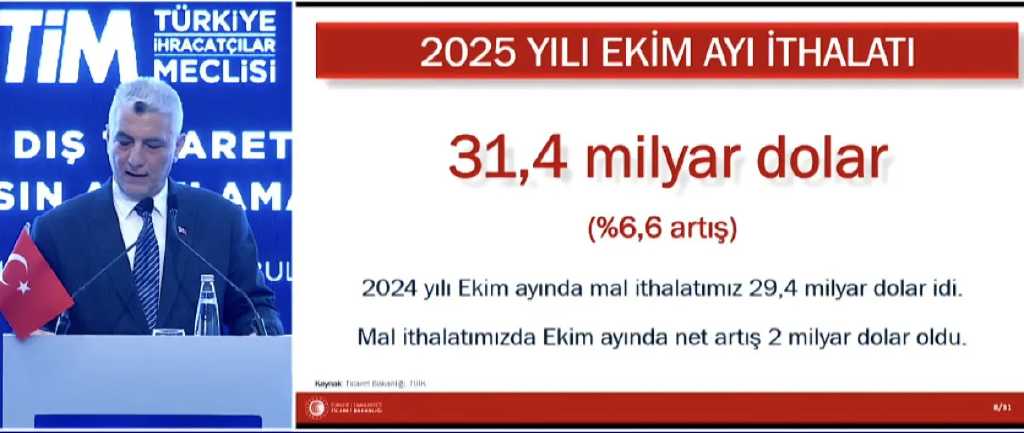 Son 12 aylık ihracat rakamı 270,2 milyar dolara çıkarak yeni zirveye ulaştı. Bolat, “Son 30 ayın 22’sinde mal ihracatımız artış gösterdi, 17’sinde ise aylık bazda rekor kırıldı” ifadelerini kullandı. Buna karşılık ekim ayında ithalat yüzde 6,6 artarak 31,4 milyar dolara çıktı. Dış ticaret açığı ise yüzde 24 artışla 7,4 milyar dolara yükseldi.