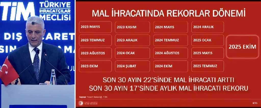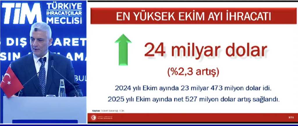Ticaret Bakanı Ömer Bolat, Türkiye’nin ekim ayı dış ticaret verilerini İstanbul’da yaptığı basın toplantısıyla açıkladı. Buna göre Türkiye’nin ihracatı ekim ayında geçen yılın aynı dönemine göre yüzde 2,3 artarak 24 milyar dolara ulaştı ve “tüm zamanların en yüksek ekim ayı ihracatı” olarak kayda geçti. Son 12 aylık ihracat ise 270,2 milyar dolara yükselerek yeni rekor kırdı.
