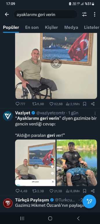 Gazi Hikmet Özcanlı'nın sosyal medya hesabında yaptığı 'Ayaklarımı Geri verin Barışalım' paylaşımının altına, çirkin yorumlarda bulunuldu.