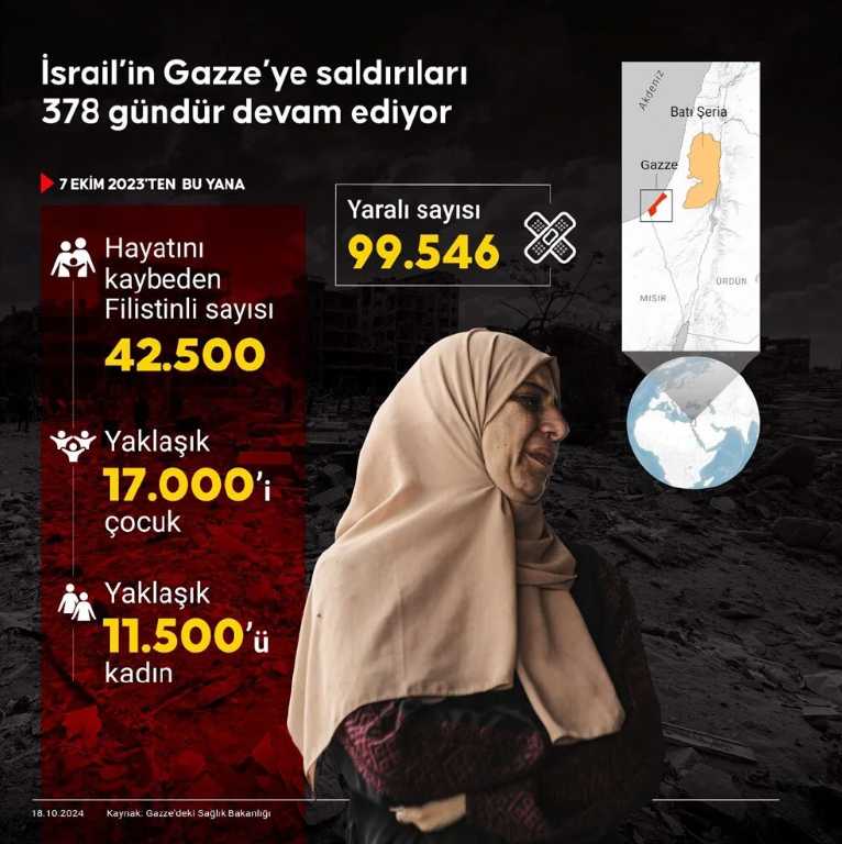 İsrail'in 7 Ekim'den bu yana Gazze Şeridi'ne düzenlediği saldırılarda yaklaşık 17 bini çocuk, 11 bin 378’i kadın olmak üzere 42 bin 438 Filistinli öldü, 99 bin 246 kişi yaralandı.