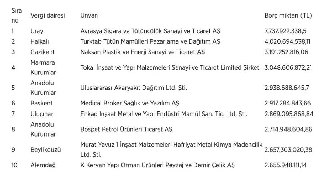 Borçlular listesinin ilk sırasında Uray Vergi Dairesine kayıtlı Avrasya Sigara ve Tütüncülük Sanayi ve Ticaret AŞ yer aldı. Şirketin devlete olan borcu 7 milyar 737 milyon 922 bin lira olarak açıklandı. Bu şirketi 4 milyar 20 milyon 695 bin lirayla Turktab Tütün Mamulleri Pazarlama ve Dağıtım AŞ, 3 milyar 191 milyon 253 bin lirayla Naksan Plastik ve Enerji Sanayi ve Ticaret AŞ izledi.