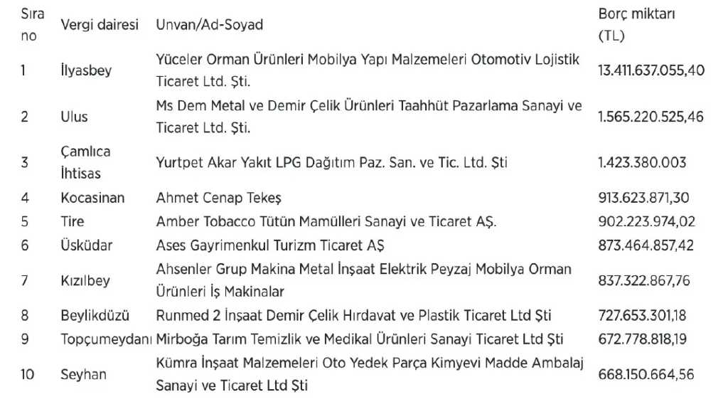 Kesinleşen tarhiyatlar listesinde ilk sırada, İlyasbey Vergi Dairesine kayıtlı Yüceler Orman Ürünleri Mobilya Yapı Malzemeleri Otomotiv Lojistik Ticaret Limited Şirketi yer aldı. Şirketin borcu 13 milyar 411 milyon 637 bin lira olarak açıklandı. Listede Ms Dem Metal ve Demir Çelik Ürünleri Taahhüt Pazarlama Sanayi ve Ticaret Limited Şirketi ile Yurtpet Akar Yakıt LPG Dağıtım Pazarlama Sanayi ve Ticaret Limited Şirketi de üst sıralarda yer aldı.