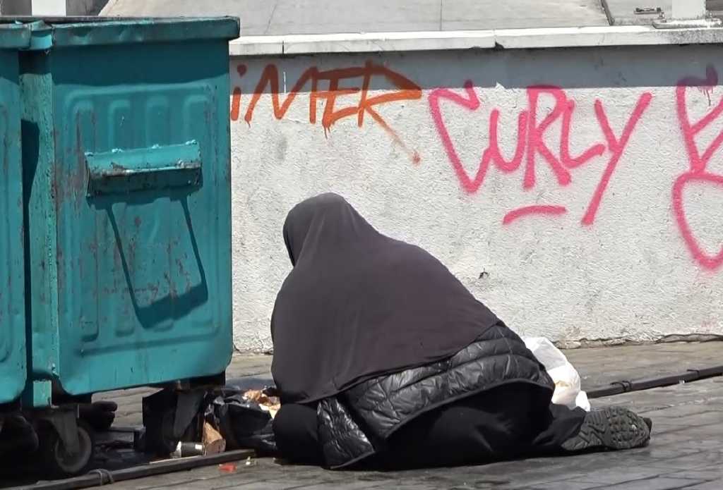 Turistlerden paraları toplayan dilenci kadın, daha sonra o bölgeden ayrıldı.
