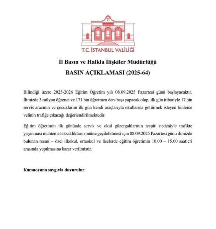 “Eğitim öğretimin ilk gününde servis ve okul güzergahlarının tespiti nedeniyle trafikte yaşanması muhtemel aksaklıkların önüne geçilebilmesi için 08 Eylül Pazartesi günü ilimizde bulunan resmi-özel ilkokul, ortaokul ve liselerde eğitim öğretimin 10.00-15.00 saatleri arasında yapılmasına karar verilmiştir.”