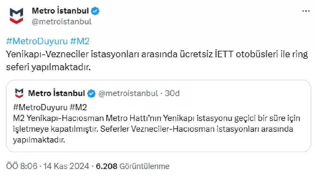 Bir diğer açıklamada ise, "Yenikapı- Vezneciler istasyonları arasında ücretsiz İETT otobüsleri ile ring seferi yapılmaktadır" ifadeleri kullanıldı.