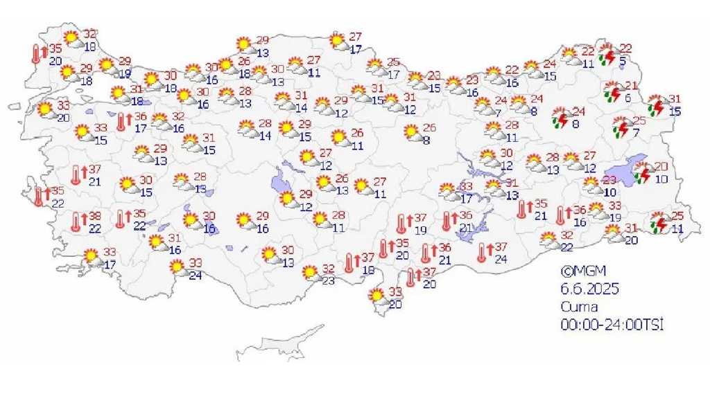 Kurban Bayramı'nın ilk günü; 6 Haziran Cuma İstanbul 29, Ankara 28, İzmir 35, Antalya 33, Diyarbakır 35, Trabzon 22, Erzurum 24 derece.